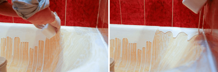 6) После первой поливки, акрил начнет медленно стекать вниз, покрывая старую поверхность белоснежной пленкой. Как правило, акриловая масса не всегда распределяется равномерно: с одного края может натечь больше, с другого - меньше, а где-то вообще пойти струей. Поэтому необходимо взять резиновый шпатель и размазать массу по кругу. Массу, которая дотекла струйкой до дна, приподымаем шпателем к верху и смазываем в бок. Затем делаем повторную заливку с того места, где дотек акрил. Жидкая масса будет стекать дальше, пока не достигнет дна.