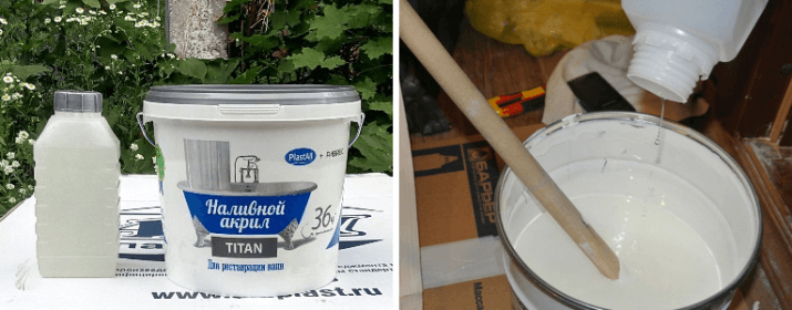 3) Открываем банку с акрилом, вливаем туда половину отвердителя. Медленными движениями мешаем состав около 2 минут. Затем заливаем оставшуюся часть затвердителя, продолжаем размешивать до однородной массы. Процесс перемешивания заканчивается в тот момент, когда пропадет прозрачный ободок жидкости между акрилом и стенками банки вокруг. При перемешивании стараемся палкой сгребать краску со стенок ведра, чтобы избежать непромеса. Плохо промешанный состав, грозит не застыванием некоторых участков на ванне.