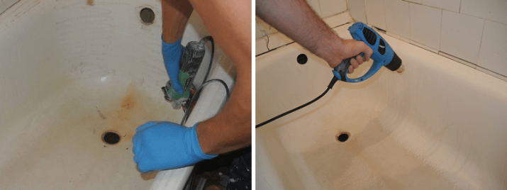 После шлифовки ванну необходимо промыть, обезжирить, просушить. Откручиваем слив-перелив и отставляем вбок. Отверстия сбоку и снизу прочистить ацетоном от въевшейся грязи. Возле края ванны раскладываем газеты, чтобы не допустить попадания акрила на кафельную плитку.