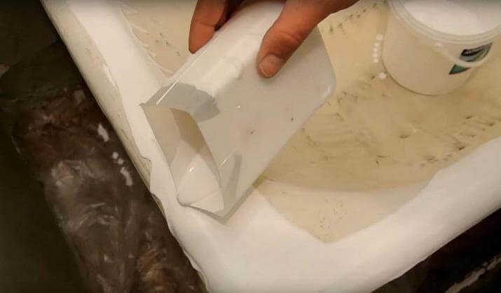 7) Все собравшуюся массу на дне разравниваем шпателем и стягиваем в направлении слива. Чтобы дно получилось ровным после застывания, необходимо шпателем немного стянуть акриловую массу со дна ближе к центру в виде холмика. Иногда акрил стекая со стенок ванны, накладывается на поверхность дна небольшим наплывом, что приведет к появлению впадины по середине.